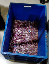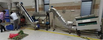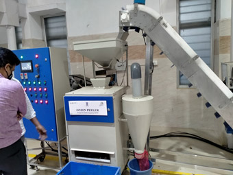 PARTNERED WITH M/S. VD ENGINEERS CHENNAI for commercialization of Machinery (designed by IIFPT) for Socio- economic benefits An Integrated unit for shallot consists of two unit operation such as destalking and deskinning. The destalking unit consists of a pair of MS grooved Rollers, Teflon strips inserted in the groove on the rollers, copper bushes for supporting rollers, Spur Gear assembly, AC Induction motor, belt & pulley assembly for driving the rollers and hoppers. The main component is the MS grooved rollers, which is supported by bushes in one end and another end is supported by the spur gear assembly. The spur gear assembly consists of two spur gears meshed with each other, bearings fitted to the MS Plates which supports the roller to rotate in its axis. The deskinning unit consists of deskinning chamber, pair of nozzle, pneumatic cylinder, Hopper and slider. The deskinning chamber is main component of this unit, made out of food grade since it has the direct contact with the shallot. The entire assembly of both the units is supported in MS Frame. |