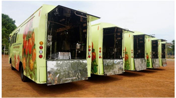 Considering this phenomenon, IIFPT Thanjavur has designed & developed a mobile processing unit (herein after referred as MPU) to support food producers and entrepreneurs which is manufactured and marketed by M.s. VD engineers chennai. MPU is for manufacturing value added basic food products from fruits and vegetables at the doorstep of farmer filed i.e. in the harvesting point. MPU facilitates producers i.e. farmers, to be an entrepreneur and make them invest on in the growth of the national economy. MPU has different machineries arranged in compact layout on the chassis of a heavy truck vehicle covered on all sides. The heavy model with power steering and Power Take Off (PTO) arrangements vehicle is converted into a mobile processing unit to accommodate the machineries in sequential order. The vehicle with cab and chassis of 135 HP direct injections 4 stroke diesel engine with 6 nos. of nylon tyre tubes is built with the body. |
